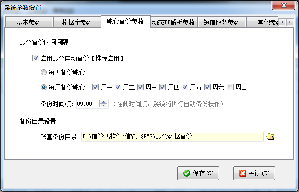 ????賬套備份參數(shù)可設(shè)置是否啟用自動(dòng)備份、備份時(shí)間間隔和備份目錄。我們強(qiáng)烈建議啟用自動(dòng)備份,以便賬套出現(xiàn)問題的時(shí)候從賬套備份文件中恢復(fù)數(shù)據(jù)。