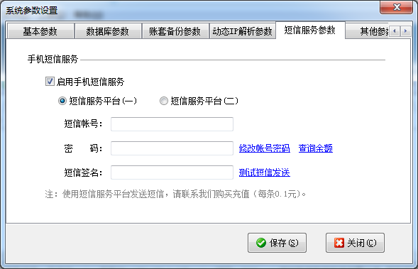 ????手機(jī)短信服務(wù)為增值服務(wù),購買后可以發(fā)送業(yè)務(wù)通知短信、登錄驗(yàn)證碼短信等,短信帳號(hào)和密碼可以在系統(tǒng)參數(shù)中配置。短信服務(wù)按條收費(fèi),如需使用可聯(lián)系客服充值購買。