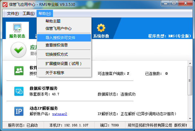????點菜單“幫助”—》“查看授權信息”可以查看已獲得的軟件授權信息(如授權用戶數、授權的擴展功能模塊等)。