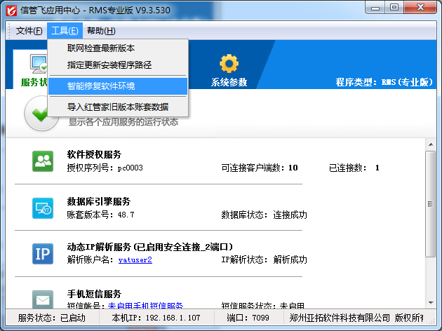 ????在應用中心點擊菜單“工具”—》“智能修復軟件環境”,然后點“智能修復”按鈕,軟件會自動重建數據庫環境,并創建桌面快捷方式。