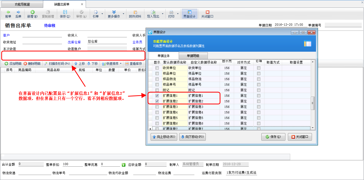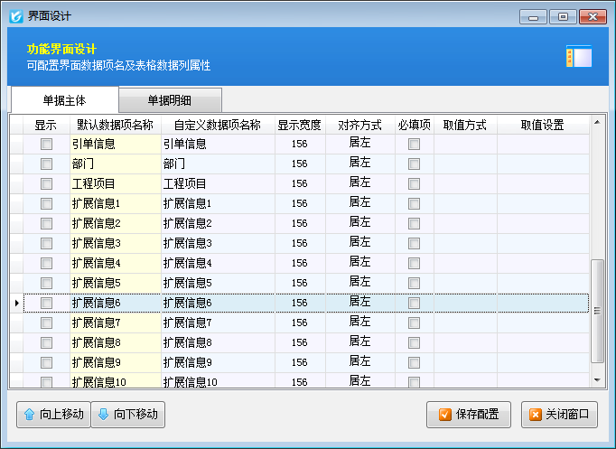 ????“單據(jù)主體”中如果打勾設(shè)置顯示數(shù)據(jù)項,但在界面上看不到,這是因為這個數(shù)據(jù)項目上方還有多個不顯示的數(shù)據(jù)項,遇到這種情況將相應(yīng)的數(shù)據(jù)項向上移動,與其他需要顯示的數(shù)據(jù)項移動到一起,然后“保存配置”按鈕即可。如下圖所示,可以將“擴展信息 1”和“擴展信息 2”移動到上面即可: