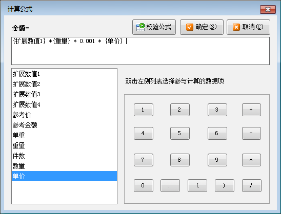 ????“單據(jù)明細(xì)”中的數(shù)據(jù)項,如果是日期類型,可以配置日期的顯示格式;部分?jǐn)?shù)據(jù)項還可以設(shè)置從“基礎(chǔ)資料”或“數(shù)據(jù)字典”中獲取數(shù)值;數(shù)量、單價、金額這三個數(shù)據(jù)項還支持設(shè)置從計算公式中取值。