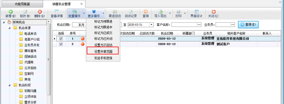 ????銷售機會管理用于管理在推銷過程中,由于環境發生變化,給銷售人員提供的實現其推銷目的的一種可能性,即銷售線索,各種途徑搜集過來的銷售業務信息(如客戶需求、購買意向、招投標信息等)。銷售機會信息可根據共享范圍進行設置,實現銷售機會的分級管理。本篇文章介紹一下如何批量設置銷售機會共享范圍?