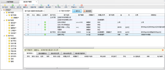 ????在左側導航樹中可以按照客戶類別、客戶級別、客戶狀態進行分類,點擊后可以顯示相應類別的潛在客戶資料。在右側點擊潛在客戶記錄后,下方會顯示與該潛在客戶有關的聯系人、銷售機會記錄、回訪記錄、合同記錄、客戶服務單記錄等信息(為了加快數據顯示速度,默認只顯示最近10條記錄)。