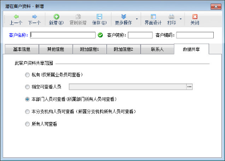 ????(3)在“數據共享”標簽頁可以設置此客戶資料的共享訪問,即具體哪些人員可以查看這個潛在客戶信息。