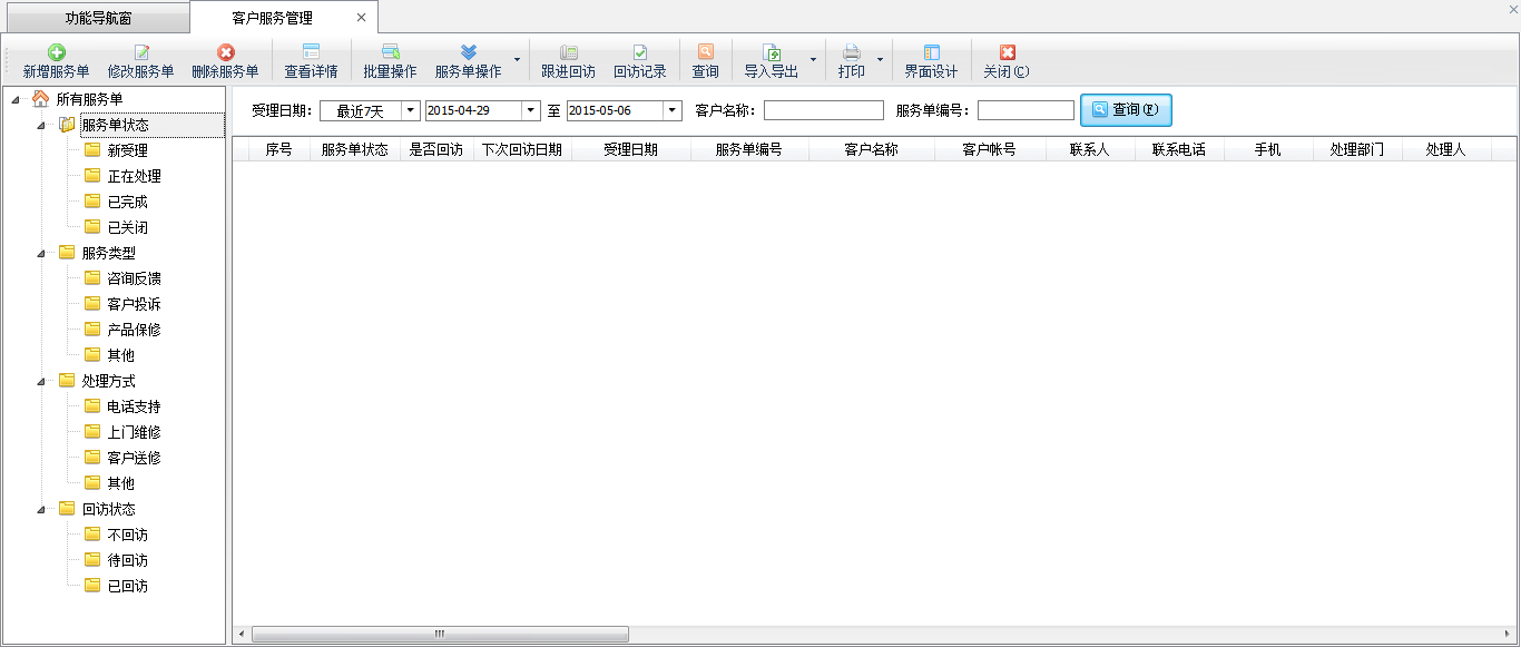 ????在界面左側導航樹中按照服務單狀態、服務類型、處理方式、回訪狀態等進行分類,點擊后可以顯示相應類別的客戶服務單資料。