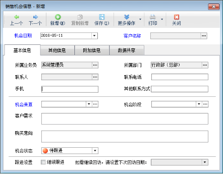 ????新增銷售機會:點工具欄中的“新增”按鈕可以增加銷售機會記錄。銷售機會中可以關聯潛在客戶,如果是新的潛在客戶,也可以直接錄入新客戶。機會錄入日期、潛在客戶、機會來源為必填寫字段。