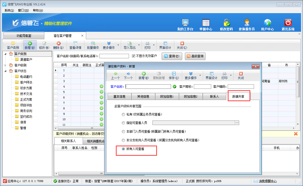 ????參數設置好之后,打開“客戶關系”模塊“潛在客戶管理”界面,新增潛在客戶,此時可看到新增潛在客戶信息時“數據共享”標簽頁中此客戶資料默認共享范圍為“所有人可查看”,如下圖所示。