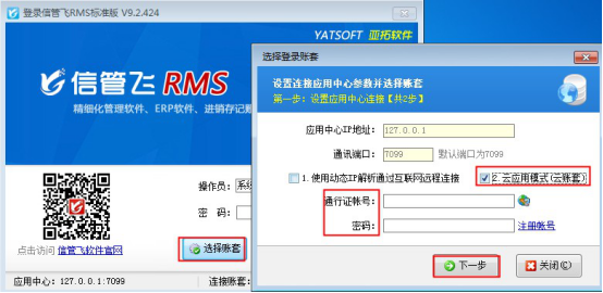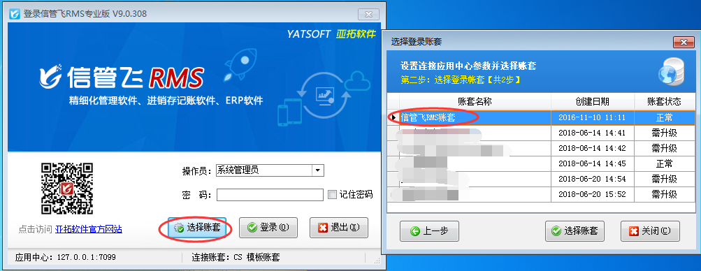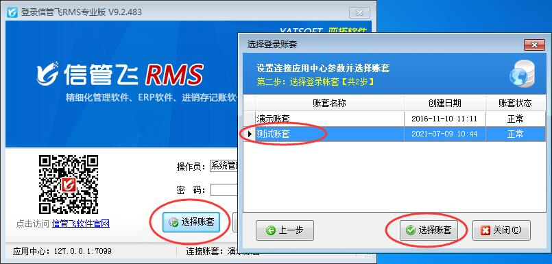 ????運(yùn)行信管飛RMS客戶端(藍(lán)色圖標(biāo)),在軟件登錄界面點(diǎn)擊“選擇賬套”,在“選擇登錄賬套”界面選擇我們所需要的賬套,然后登錄軟件即可。