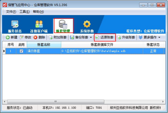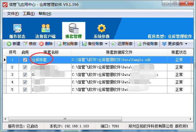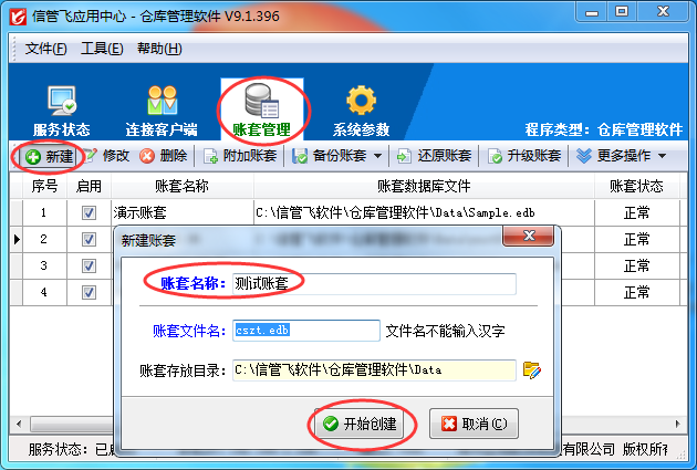 ????賬套即賬套數(shù)據(jù)庫(kù),這是一個(gè)會(huì)計(jì)業(yè)務(wù)引申出來(lái)的概念,賬套數(shù)據(jù)庫(kù)中存儲(chǔ)業(yè)務(wù)數(shù)據(jù)。使用軟件之前建議新增加一個(gè)賬套,用于重新錄入和管理數(shù)據(jù),信管飛RMS、信管飛倉(cāng)庫(kù)管理軟件、信管飛送貨單軟件、信管飛出納記賬軟件、信管飛票據(jù)打印軟件等軟件的賬套都是在主機(jī)電腦的應(yīng)用中心程序上集中管理的,下面我們以信管飛倉(cāng)庫(kù)管理軟件為例詳細(xì)介紹下在使用軟件之前如何新增加一個(gè)賬套?