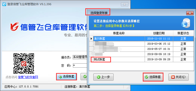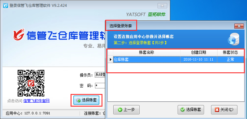 ????運(yùn)行信管飛倉(cāng)庫(kù)管理軟件客戶端(藍(lán)色圖標(biāo)),在軟件登錄界面點(diǎn)擊“選擇賬套”,在“選擇登錄賬套”界面選擇我們所需要的賬套,然后登錄軟件即可。