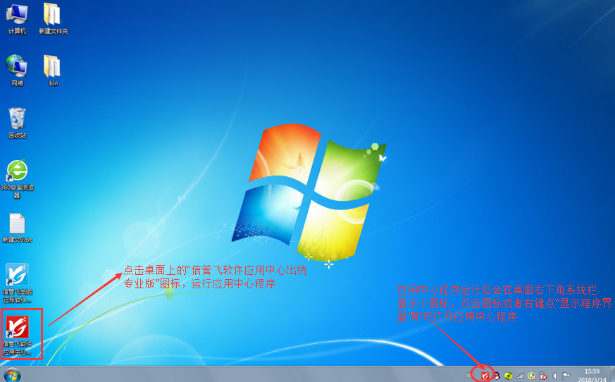????運(yùn)行信管飛出納記賬軟件應(yīng)用中心并打開(kāi)信管飛出納記賬軟件應(yīng)用中心程序界面,主機(jī)電腦上軟件安裝后會(huì)在桌面上自動(dòng)創(chuàng)建“信管飛出納記賬軟件應(yīng)用中心(紅色圖標(biāo))”及“信管飛出納記賬軟件即客戶端(藍(lán)色圖標(biāo))”的快捷方式,點(diǎn)擊“信管飛出納記賬軟件應(yīng)用中心(紅色圖標(biāo))”即可運(yùn)行信管飛出納記賬軟件應(yīng)用中心,如下圖所示。