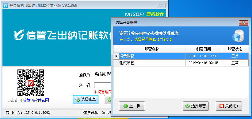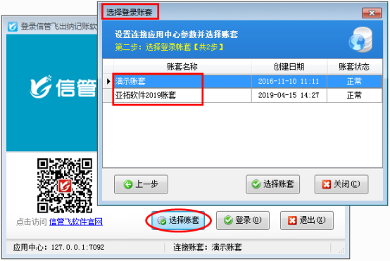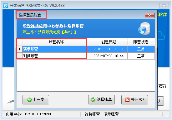 ????從新打開(kāi)應(yīng)用中心后,電腦右下角會(huì)顯示應(yīng)用中心圖標(biāo)。然后打開(kāi)客戶端程序(藍(lán)色圖標(biāo)),登錄界面點(diǎn)擊“選擇帳套”,然后下一步,然后會(huì)出現(xiàn)選擇登錄帳套窗口,此時(shí)顯示的可登錄的帳套列表。剛才已停用的“信管飛帳套”已不在列表內(nèi),無(wú)法選擇到了,如圖所示。