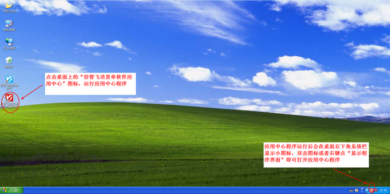 ????運(yùn)行信管飛送貨單軟件應(yīng)用中心并打開(kāi)信管飛送貨單軟件應(yīng)用中心程序界面,主機(jī)電腦上軟件安裝后會(huì)在桌面上自動(dòng)創(chuàng)建“信管飛送貨單軟件應(yīng)用中心(紅色圖標(biāo))”及“信管飛送貨單軟件即客戶端(藍(lán)色圖標(biāo))”的快捷方式,點(diǎn)擊“信管飛送貨單軟件應(yīng)用中心(紅色圖標(biāo))”即可運(yùn)行信管飛送貨單軟件應(yīng)用中心,如下圖所示。