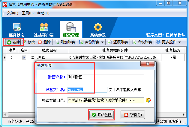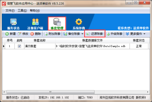 ????賬套即賬套數(shù)據(jù)庫(kù),這是一個(gè)會(huì)計(jì)業(yè)務(wù)引申出來(lái)的概念,賬套數(shù)據(jù)庫(kù)中存儲(chǔ)業(yè)務(wù)數(shù)據(jù)。使用軟件之前建議新增加一個(gè)賬套,用于重新錄入和管理數(shù)據(jù),信管飛RMS、信管飛倉(cāng)庫(kù)管理軟件、信管飛送貨單軟件、信管飛出納記賬軟件、信管飛票據(jù)打印軟件等軟件的賬套都是在主機(jī)電腦的應(yīng)用中心程序上集中管理的,下面我們以信管飛送貨單軟件為例詳細(xì)介紹下在使用軟件之前如何新增加一個(gè)賬套?