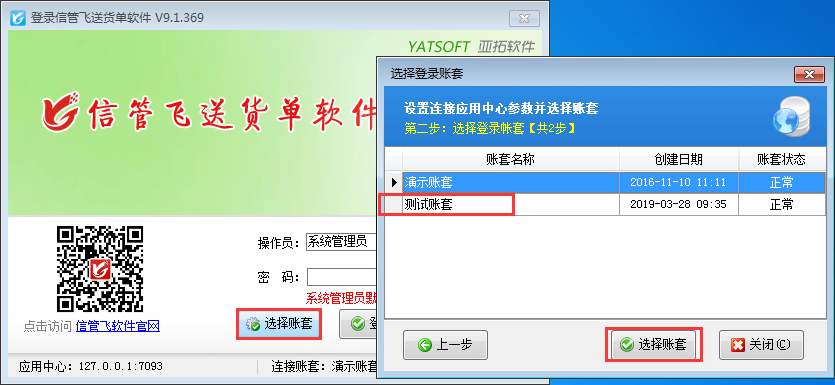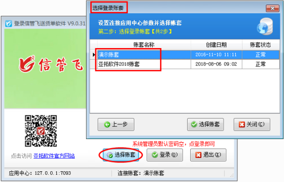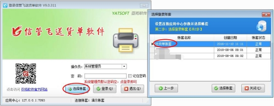 ????運(yùn)行信管飛送貨單軟件客戶端(藍(lán)色圖標(biāo)),在軟件登錄界面點(diǎn)擊“選擇賬套”,在“選擇登錄賬套”界面選擇我們所需要的賬套,然后登錄軟件即可。