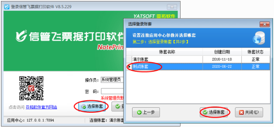 ????運(yùn)行信管飛票據(jù)打印軟件客戶端(藍(lán)色圖標(biāo)),在軟件登錄界面點(diǎn)擊“選擇賬套”,在“選擇登錄賬套”界面選擇我們所需要的賬套,然后登錄軟件即可。