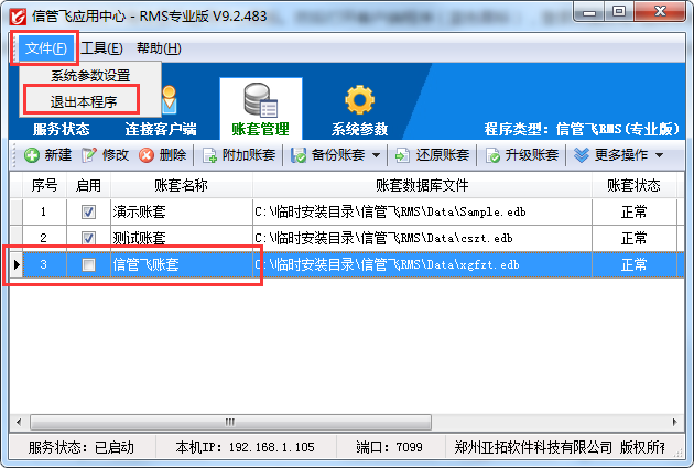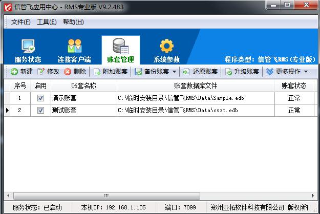 ????亞拓軟件旗下的信管飛RMS、信管飛倉(cāng)庫(kù)管理軟件、信管飛送貨單軟件、信管飛出納記賬軟件、信管飛票據(jù)打印軟件等新架構(gòu)程序軟件安裝后會(huì)顯示兩個(gè)圖標(biāo),一個(gè)是應(yīng)用中心程序(紅色圖標(biāo)),一個(gè)是客戶端程序(藍(lán)色圖標(biāo))。這些軟件都含有賬套管理功能,在應(yīng)用中心里面可以建立多個(gè)賬套,已使用的帳套如果不再繼續(xù)使用,可以停用帳套,停用帳套后,客戶端程序登錄時(shí)無(wú)法連接該帳套。我們以信管飛RMS為例演示一下如何停用帳套。
