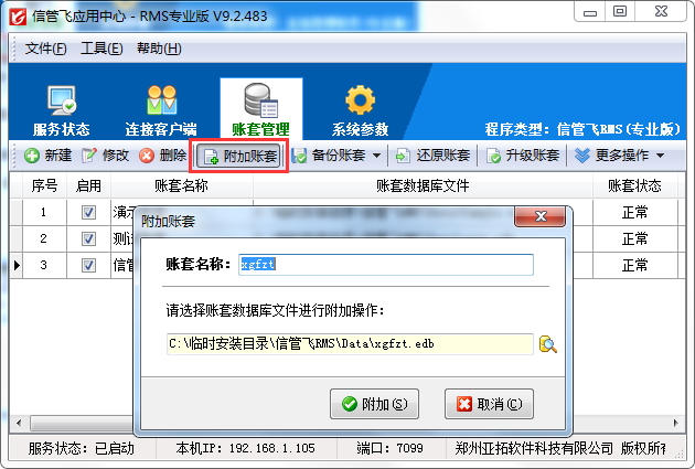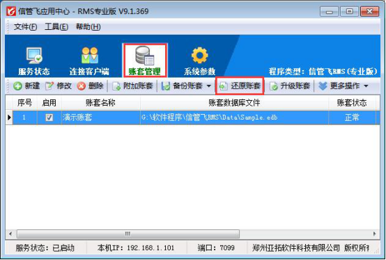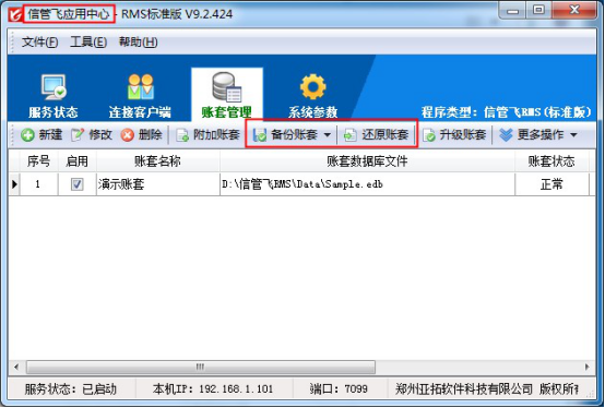 ????信管飛RMS、信管飛倉(cāng)庫(kù)管理軟件中都含有賬套管理功能,賬套管理實(shí)現(xiàn)賬套數(shù)據(jù)庫(kù)的集中管理,包括新建賬套、修改賬套屬性、刪除賬套、附加賬套、備份賬套、還原賬套和升級(jí)賬套等功能。下面我們以信管飛RMS為例來(lái)演示一下賬套管理中各個(gè)功能具體的操作方法。