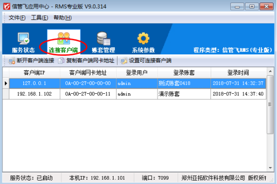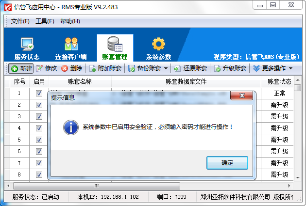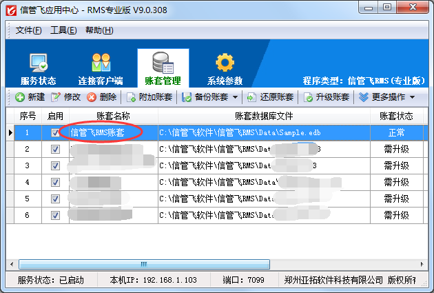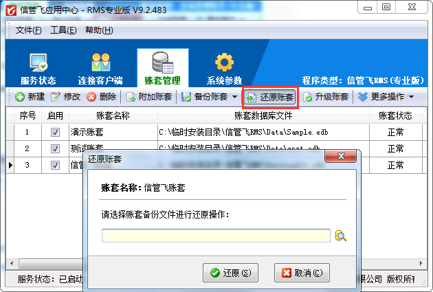 ????打開(kāi)信管飛RMS應(yīng)用中心(桌面右下角紅色的圖標(biāo))—》“賬套管理”即可進(jìn)入賬套管理界面,如下圖所示:
