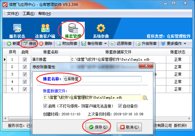????以“信管飛倉(cāng)庫(kù)管理軟件”為例,示范下如何修改賬套的名稱。打開(kāi)紅色的應(yīng)用中心程序(應(yīng)用中心運(yùn)行后桌面右下角會(huì)顯示相應(yīng)的圖標(biāo),點(diǎn)擊即可打開(kāi)應(yīng)用中心主界面),在賬套管理界面,點(diǎn)擊賬套后選擇工具欄中的“修改”按鈕,彈出“修改賬套屬性”界面,把“演示賬套”修改為“倉(cāng)庫(kù)賬套”,然后點(diǎn)擊“保存”按鈕,如下圖所示: