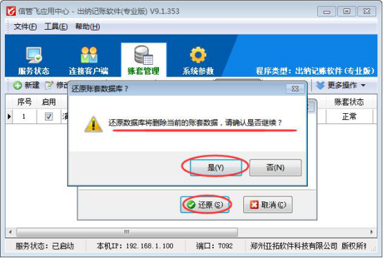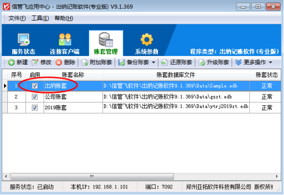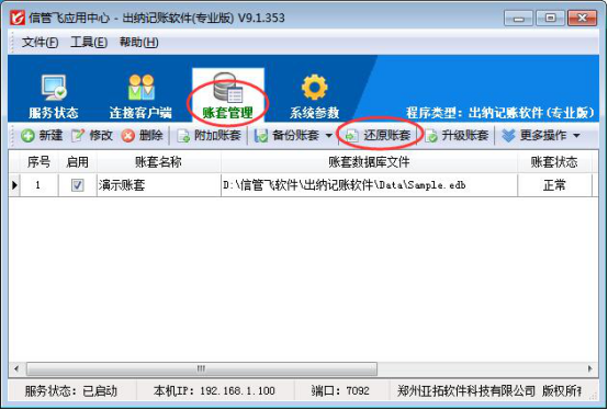 ????賬套即賬套數(shù)據(jù)庫(kù),這是一個(gè)會(huì)計(jì)業(yè)務(wù)引申出來(lái)的概念,賬套數(shù)據(jù)庫(kù)中存儲(chǔ)業(yè)務(wù)數(shù)據(jù)。使用軟件之前建議新增加一個(gè)賬套,用于重新錄入和管理數(shù)據(jù),信管飛RMS、信管飛倉(cāng)庫(kù)管理軟件、信管飛送貨單軟件、信管飛出納記賬軟件、信管飛票據(jù)打印軟件等軟件的賬套都是在主機(jī)電腦的應(yīng)用中心程序上集中管理的,下面我們以信管飛出納記賬軟件為例詳細(xì)介紹下在使用軟件之前如何新增加一個(gè)賬套?