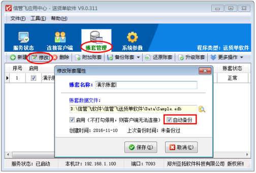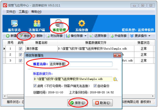 ????以“信管飛送貨單軟件”為例,示范下如何修改賬套的名稱。打開(kāi)紅色的應(yīng)用中心程序(應(yīng)用中心運(yùn)行后桌面右下角會(huì)顯示相應(yīng)的圖標(biāo),點(diǎn)擊即可打開(kāi)應(yīng)用中心主界面),在賬套管理界面,點(diǎn)擊賬套后選擇工具欄中的“修改”按鈕,彈出“修改賬套屬性”界面,把“演示賬套”修改為“送貨單賬套”,然后點(diǎn)擊“保存”按鈕,如下圖所示: