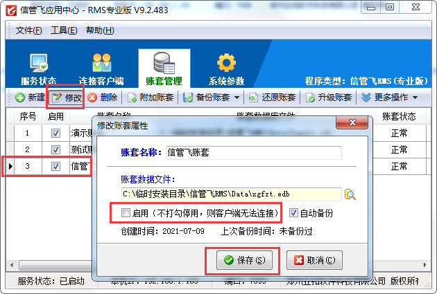 ????應(yīng)用中心(紅色圖標(biāo))打開(kāi)后會(huì)在電腦的右下角顯示,雙擊打開(kāi)電腦右下角的應(yīng)用中心圖標(biāo),點(diǎn)擊“帳套管理”,如圖所示,帳套列表一共有3個(gè)帳套啟用,現(xiàn)在我們對(duì)第三個(gè)帳套“信管飛帳套”進(jìn)行停用。選擇帳套后,點(diǎn)擊“修改”按鈕,系統(tǒng)彈出修改帳套屬性窗口,把“啟用”的打勾取消,然后點(diǎn)擊“保存”按鈕。