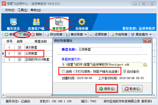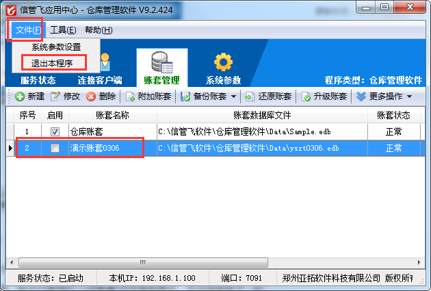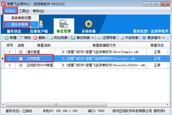 ????亞拓軟件旗下的信管飛RMS、信管飛倉(cāng)庫(kù)管理軟件、信管飛送貨單軟件、信管飛出納記賬軟件、信管飛票據(jù)打印軟件等軟件程序安裝后會(huì)顯示兩個(gè)圖標(biāo),一個(gè)是應(yīng)用中心程序(紅色圖標(biāo)),一個(gè)是客戶端程序(藍(lán)色圖標(biāo))。這些軟件都含有賬套管理功能,在應(yīng)用中心里面可以建立多個(gè)賬套,已使用的帳套如果不再繼續(xù)使用,可以停用帳套,停用帳套后,客戶端程序登錄時(shí)無(wú)法連接該帳套。我們以信管飛送貨單軟件為例演示一下如何停用帳套。