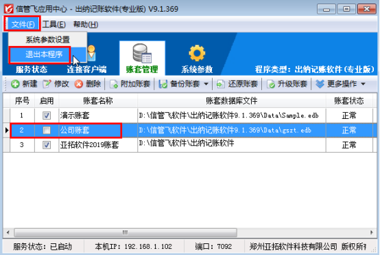 ????亞拓軟件旗下的信管飛RMS、信管飛倉(cāng)庫(kù)管理軟件、信管飛送貨單軟件、信管飛出納記賬軟件、信管飛票據(jù)打印軟件等軟件程序安裝后會(huì)顯示兩個(gè)圖標(biāo),一個(gè)是應(yīng)用中心程序(紅色圖標(biāo)),一個(gè)是客戶端程序(藍(lán)色圖標(biāo))。這些軟件都含有賬套管理功能,在應(yīng)用中心里面可以建立多個(gè)賬套,已使用的帳套如果不再繼續(xù)使用,可以停用帳套,停用帳套后,客戶端程序登錄時(shí)無(wú)法連接該帳套。我們以信管飛出納記賬軟件專業(yè)版為例演示一下如何停用帳套。