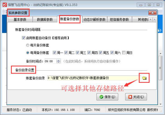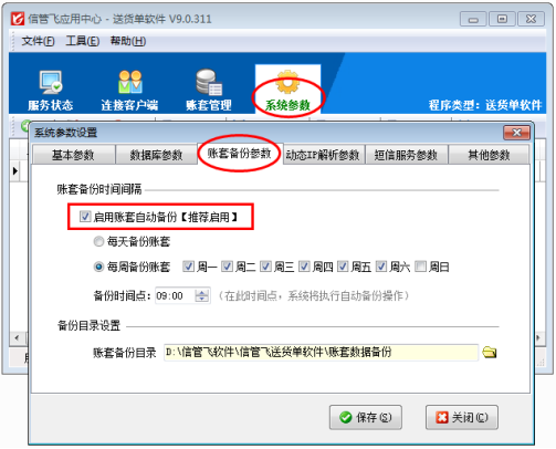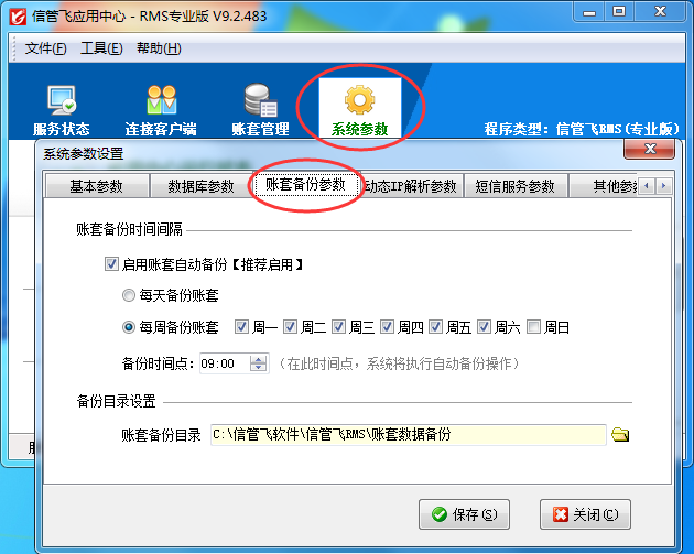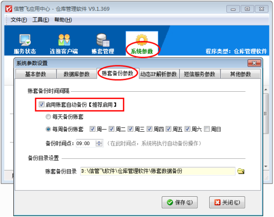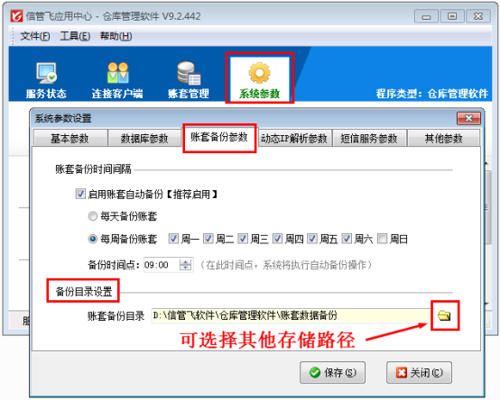 ????本文以信管飛倉(cāng)庫(kù)管理軟件為例,介紹下如何修改賬套備份存儲(chǔ)目錄,打開(kāi)應(yīng)用中心程序(紅色圖標(biāo)),點(diǎn)擊“系統(tǒng)參數(shù)”進(jìn)入?yún)?shù)設(shè)置界面,選擇“賬套備份參數(shù)”,在賬套備份目錄設(shè)置中,可以修改默認(rèn)目錄,如下圖所示: