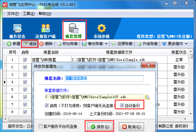 ????信管飛RMS、信管飛倉(cāng)庫(kù)管理軟件、信管飛出納記賬軟件、信管飛送貨單軟件及信管飛票據(jù)軟件都支持設(shè)置賬套自動(dòng)備份,我們強(qiáng)烈建議啟用自動(dòng)備份功能,以便賬套出現(xiàn)問(wèn)題的時(shí)候從賬套備份文件中恢復(fù)數(shù)據(jù)。本節(jié)我們以信管飛RMS為例詳細(xì)介紹一下如何啟用賬套自動(dòng)備份功能?