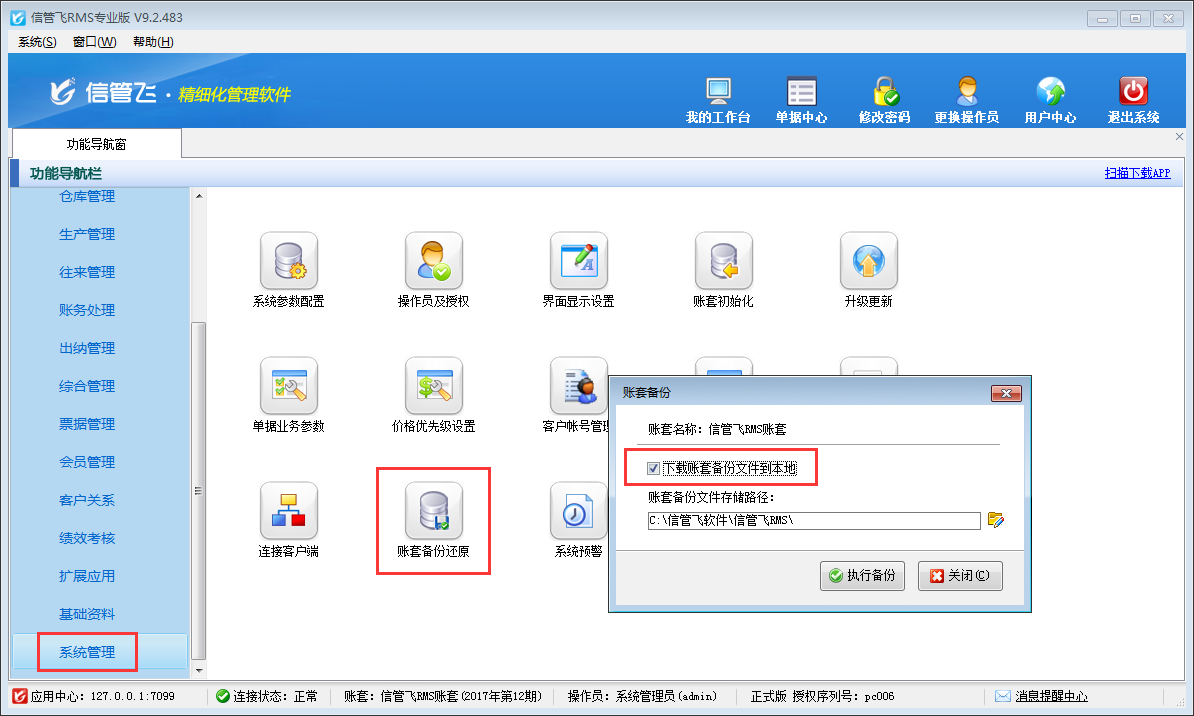 ????登錄信管飛RMS客戶端,在功能導(dǎo)航窗中點(diǎn)擊“系統(tǒng)管理”——“賬套備份”同樣可以執(zhí)行賬套備份操作,如下圖所示。