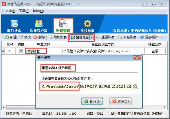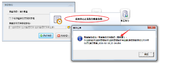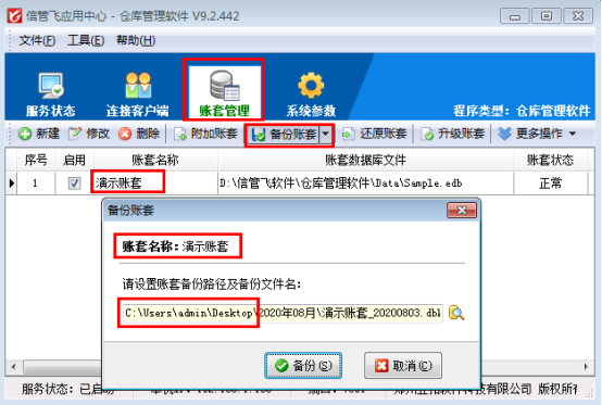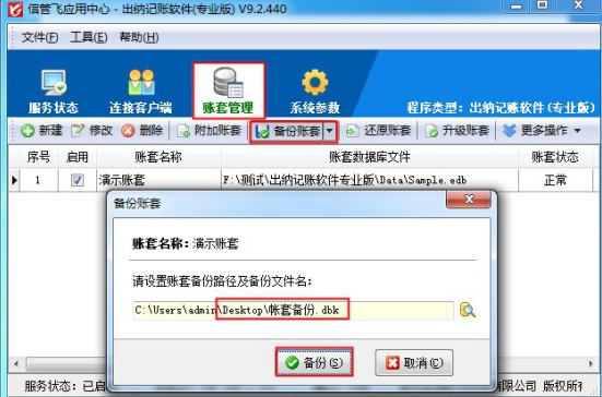 ????設(shè)置好備份目錄后,返回至應(yīng)用中心程序“賬套管理”界面,選擇一個(gè)賬套,點(diǎn)擊“備份賬套”可以看到彈出的備份賬套的界面保存目錄為設(shè)置的保存目錄“桌面”上,如下圖所示: