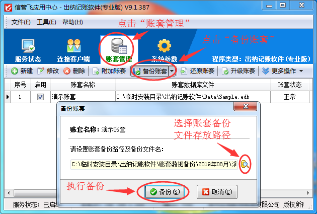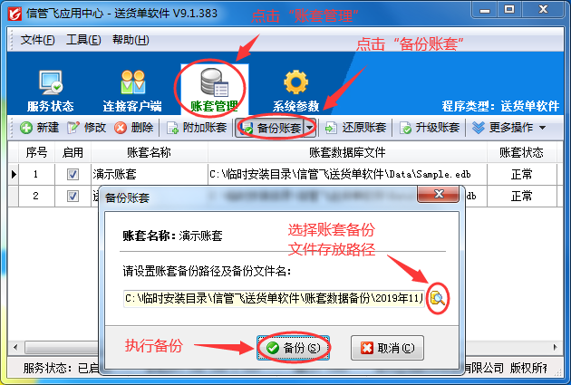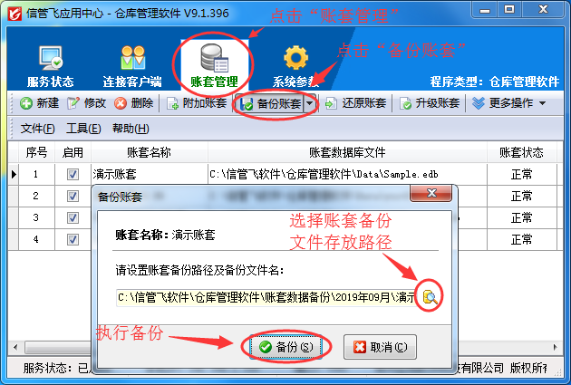 ????一、在信管飛倉(cāng)庫(kù)管理軟件應(yīng)用中心程序中執(zhí)行賬套備份。