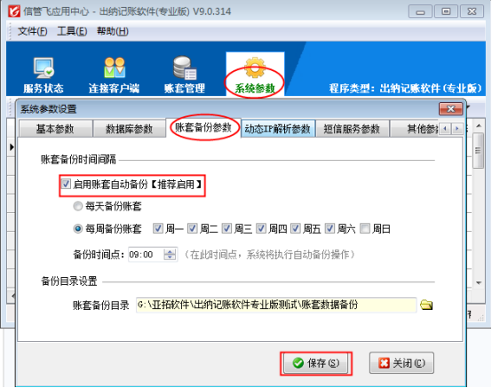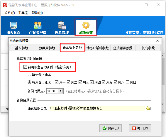 ????首先打開(kāi)軟件應(yīng)用中心主界面,點(diǎn)擊“系統(tǒng)參數(shù)”—“賬套備份參數(shù)”可以打開(kāi)賬套備份參數(shù)界面,賬套備份參數(shù)內(nèi)可設(shè)置是否啟用自動(dòng)備份、備份時(shí)間間隔和備份目錄,如下圖所示。