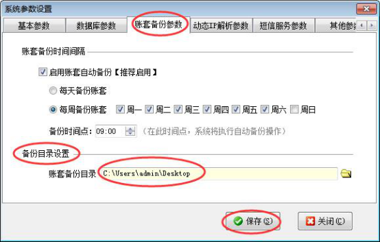 ????另外在“系統(tǒng)參數(shù)”——“賬套備份參數(shù)”中可以設(shè)置是否啟用自動(dòng)備份、備份時(shí)間間隔和備份目錄。我們強(qiáng)烈建議啟用自動(dòng)備份,以便賬套出現(xiàn)問(wèn)題的時(shí)候從賬套備份文件中恢復(fù)數(shù)據(jù)。