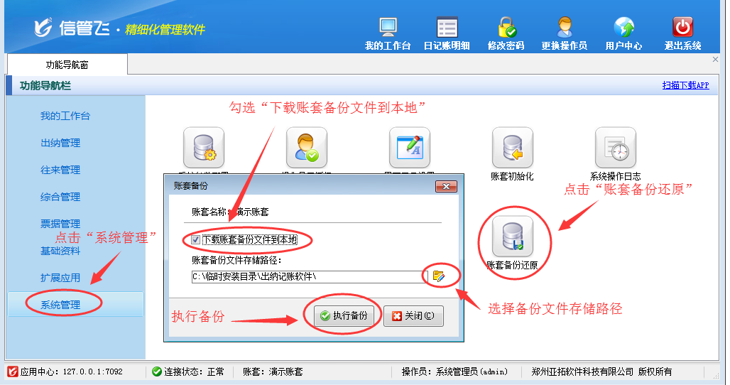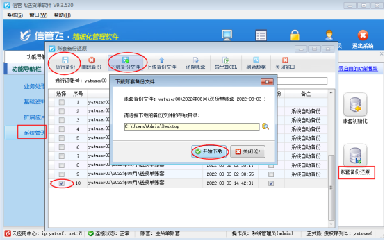 ????云賬套版本數(shù)據(jù)默認(rèn)存儲(chǔ)在云服務(wù)器上,需要換到本地版使用,在云賬號(hào)即將到期時(shí)打開(kāi)“系統(tǒng)管理”—》“賬套備份還原”,在賬套備份還原界面點(diǎn)擊“執(zhí)行備份”,執(zhí)行備份完成,選擇下備份文件,點(diǎn)擊“下載備份文件”到選擇的存放目錄中,隨后點(diǎn)擊“開(kāi)始下載”,完成后則云賬套數(shù)據(jù)備份下載到本地存放目錄中,如下圖所示: