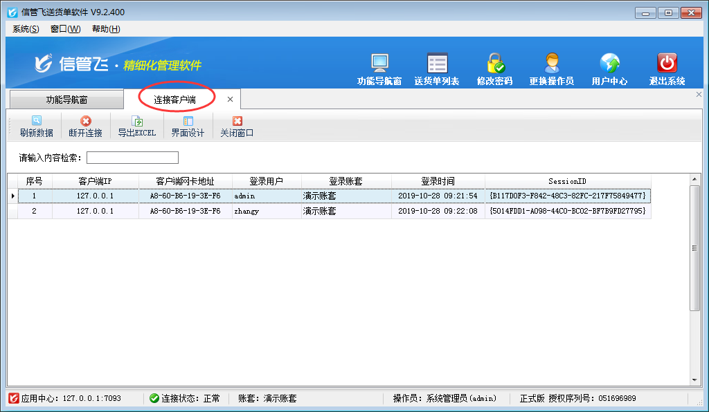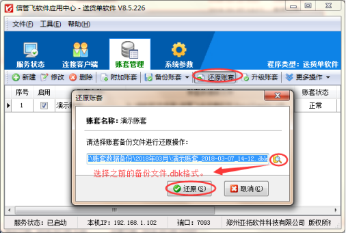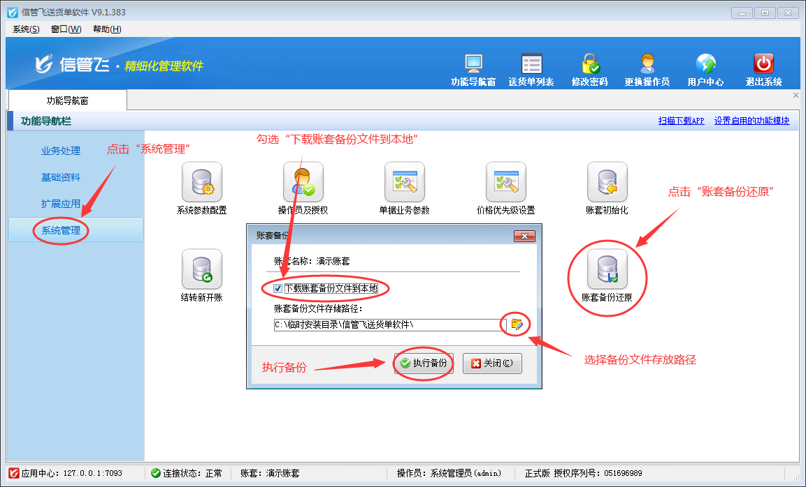 ????信管飛RMS、信管飛送貨單軟件、信管飛出納記賬軟件、信管飛倉(cāng)庫(kù)管理軟件等都支持免費(fèi)下載安裝試用。試用版本中會(huì)存在一個(gè)演示賬套。演示賬套中有演示數(shù)據(jù),方便試用軟件功能(賬套即賬套數(shù)據(jù)庫(kù),這是一個(gè)會(huì)計(jì)業(yè)務(wù)引申出來(lái)的概念,賬套數(shù)據(jù)庫(kù)中存儲(chǔ)業(yè)務(wù)數(shù)據(jù))。如后續(xù)購(gòu)買(mǎi)為正式版本,可以繼續(xù)使用演示賬套。為了區(qū)分賬套數(shù)據(jù),軟件支持修改賬套的名稱。