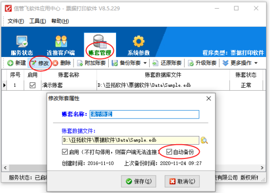 ????2、修改:修改賬套屬性時(shí),如果有客戶端已登錄這個(gè)賬套,則需要先退出客戶端程序,然后再進(jìn)行賬套屬性的修改。修改賬套屬性時(shí),可以不啟用賬套(即停用),停用后的賬套客戶端程序無(wú)法連接;設(shè)置是否自動(dòng)備份賬套,如果設(shè)置自動(dòng)備份,并且系統(tǒng)參數(shù)設(shè)置中也啟用了賬套備份,則軟件會(huì)按照賬套備份參數(shù)中的時(shí)間間隔定期備份此賬套,如下圖所示。