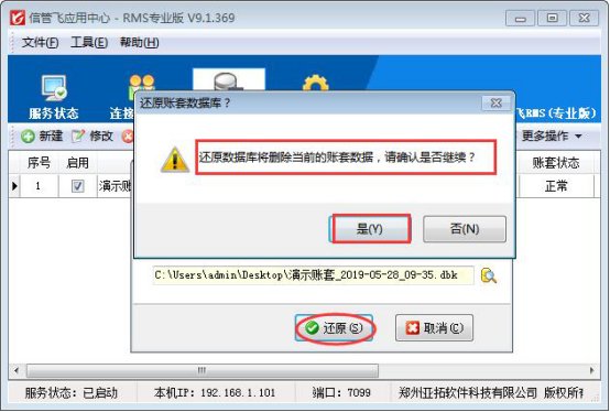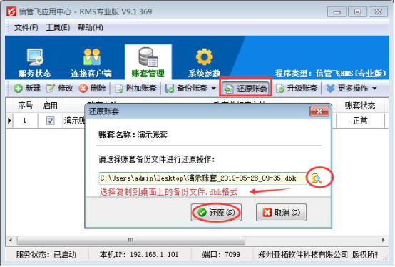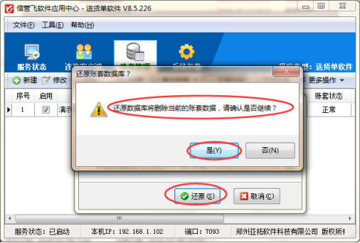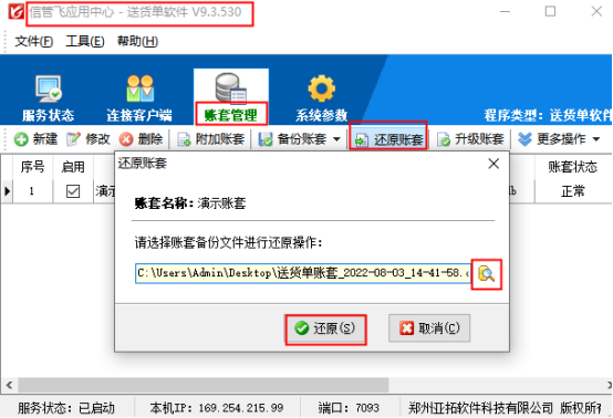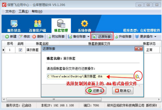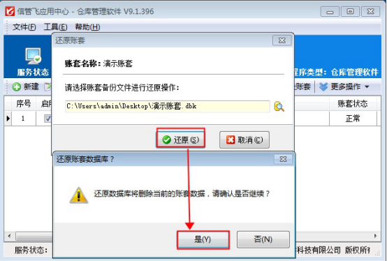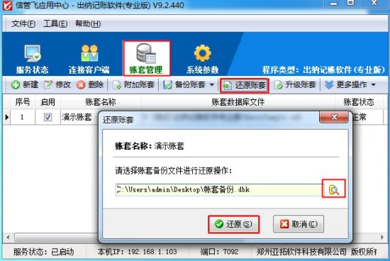????備份文件下載到本地后,如果需要本地版使用,需要重新購(gòu)買(mǎi)本地版軟件,云賬號(hào)到期不再續(xù)費(fèi)。本地版軟件需安裝應(yīng)用中心程序(紅色圖標(biāo)),購(gòu)買(mǎi)軟件后把分配的授權(quán)在應(yīng)用中心程序中獲取下,然后打開(kāi)賬套管理界面點(diǎn)擊“還原賬套”,選擇下載到本地的云端備份文件,點(diǎn)擊還原即可。還原成功后,登錄本地版客戶端程序,可登錄查看數(shù)據(jù),如下圖所示: