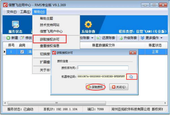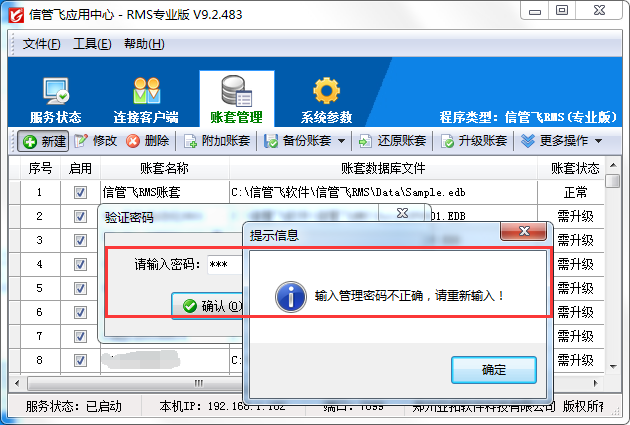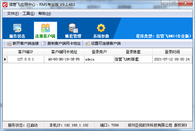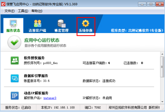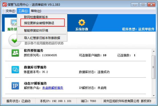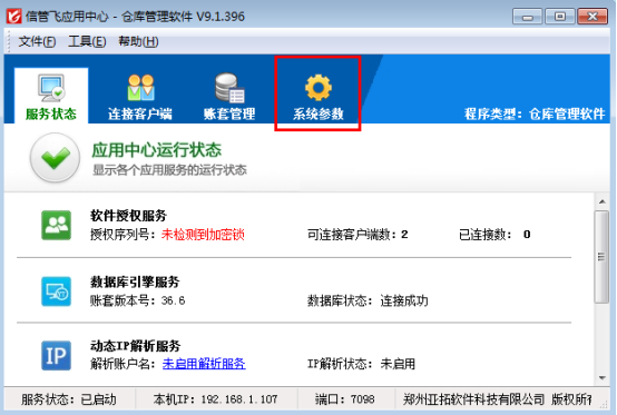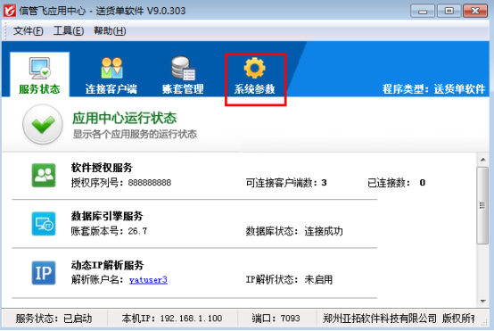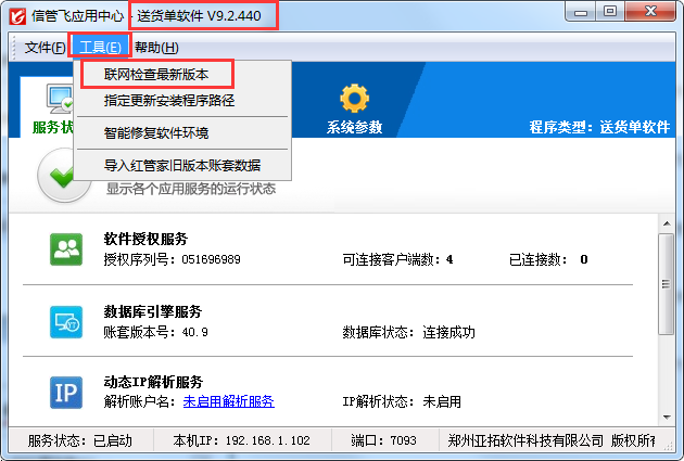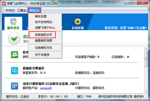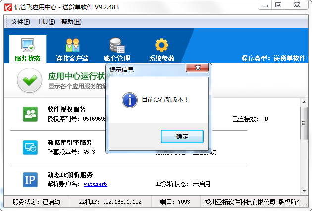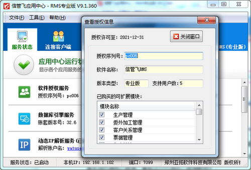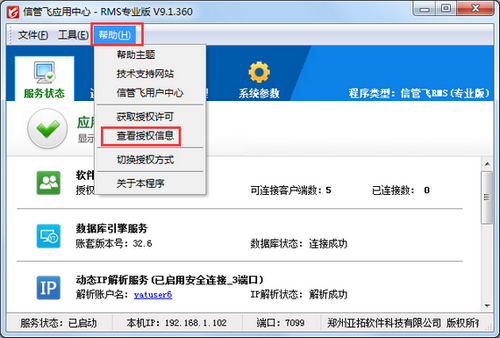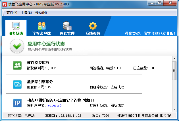 ????信管飛RMS、信管飛倉(cāng)庫(kù)管理軟件、信管飛出納記賬軟件、信管飛送貨單軟件和信管飛票據(jù)打印軟件都由客戶端程序和應(yīng)用中心程序兩部分組成,應(yīng)用中心可以全面掌控軟件的運(yùn)行情況,可以隨時(shí)查看各類服務(wù)的運(yùn)行狀態(tài),主要包括軟件授權(quán)服務(wù)情況、數(shù)據(jù)庫(kù)引擎服務(wù)情況、動(dòng)態(tài)IP解析服務(wù)情況、手機(jī)短信服務(wù)情況等。下面我們以信管飛RMS專業(yè)版為例介紹一下應(yīng)用中心的服務(wù)狀態(tài)。