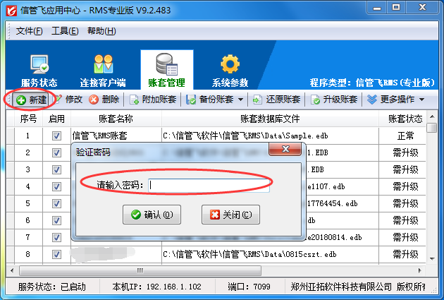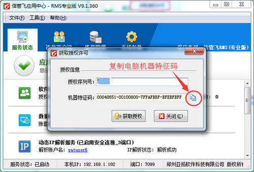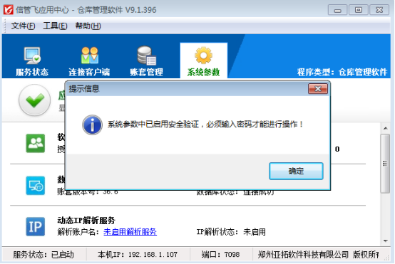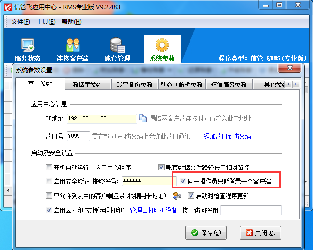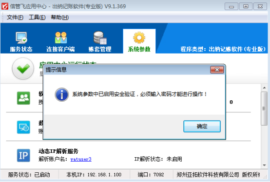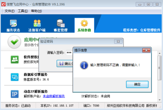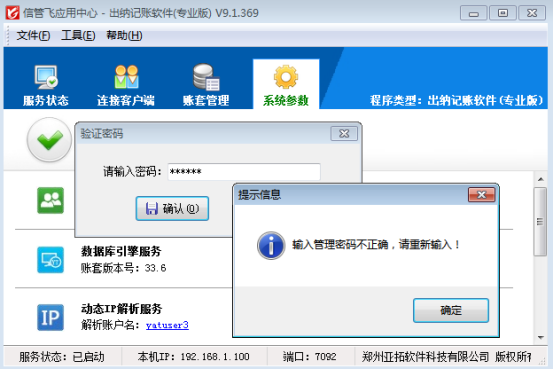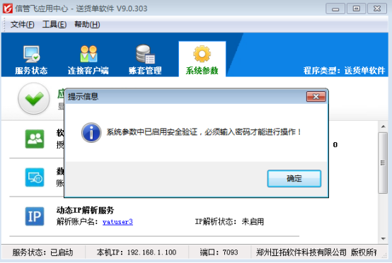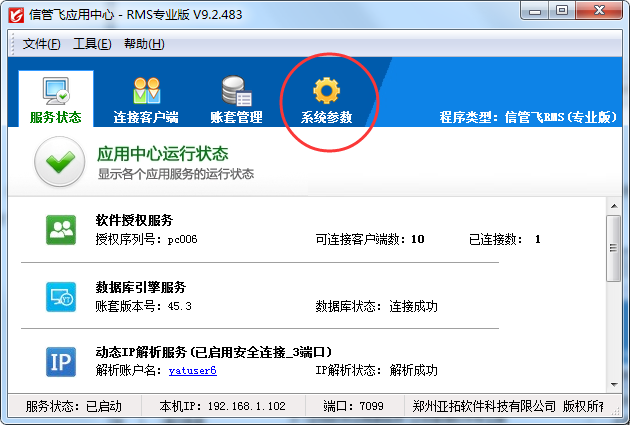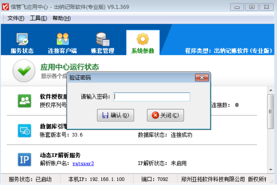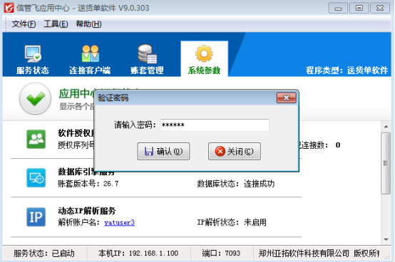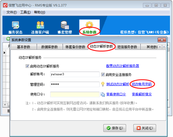 ????動(dòng)態(tài)IP解析服務(wù)是亞拓軟件開(kāi)發(fā)的基于互聯(lián)網(wǎng)的遠(yuǎn)程連接解決方案,采用專屬安全技術(shù),可以支持網(wǎng)絡(luò)版本在異地連接主機(jī)電腦進(jìn)行共享數(shù)據(jù)使用。動(dòng)態(tài)IP解析服務(wù)屬于增值服務(wù),使用需要另外進(jìn)行購(gòu)買(mǎi),購(gòu)買(mǎi)后會(huì)分配解析賬號(hào)、管理密碼和使用口令信息,管理密碼和使用口令可以自己修改。下面我們以信管飛RMS為例介紹一下如何修改動(dòng)態(tài)IP解析服務(wù)的管理密碼及使用口令。