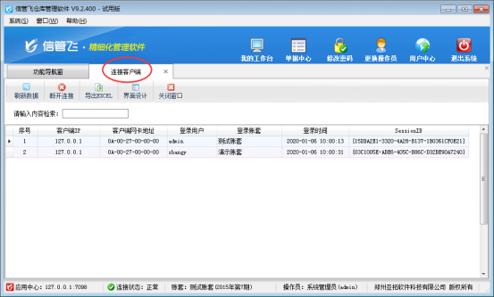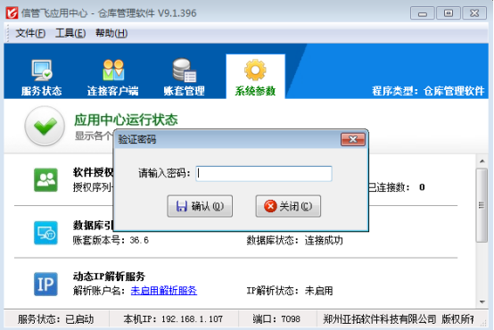 ????軟件授權(quán)服務(wù)顯示加密鎖編號(hào),授權(quán)連接客戶端數(shù)(用戶數(shù))以及已連接的客戶端數(shù)。授權(quán)服務(wù)為軟件的核心服務(wù),正式使用軟件的時(shí)候必須一直插入加密鎖,拔下加密鎖即進(jìn)入試用版模式(超過(guò)試用版的單據(jù)數(shù)限制就會(huì)無(wú)法保存數(shù)據(jù))。