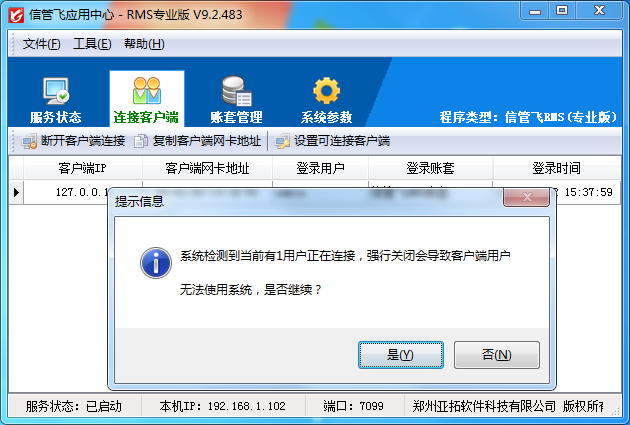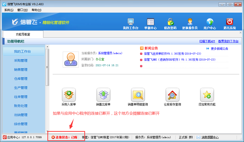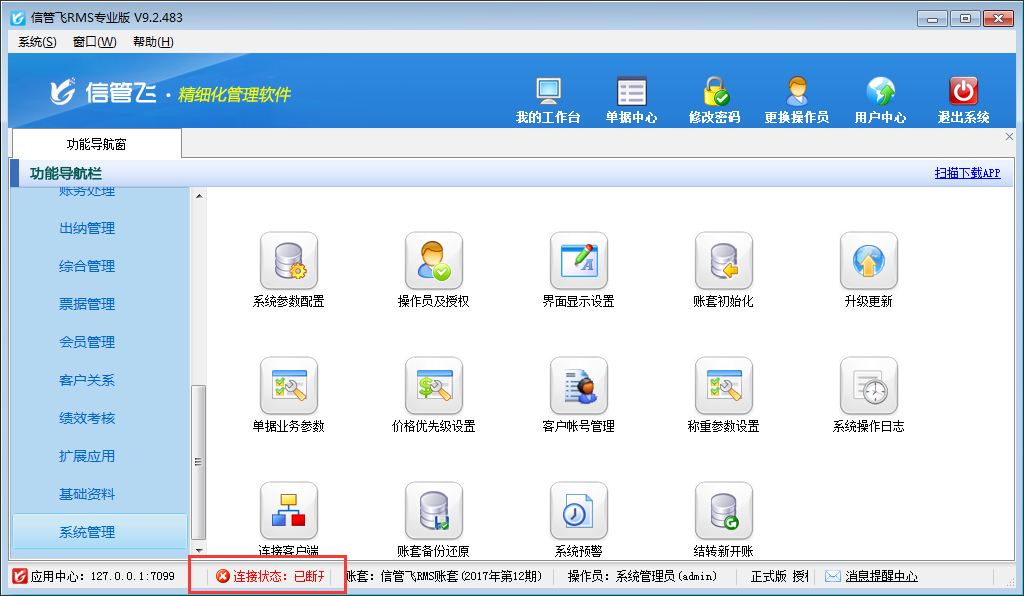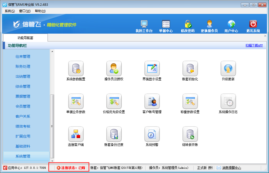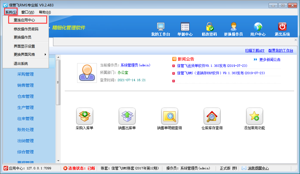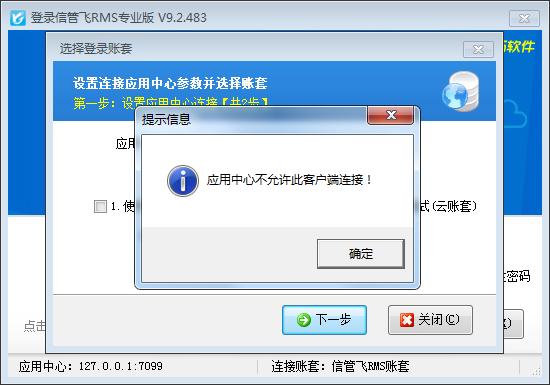 ????信管飛RMS、信管飛倉(cāng)庫(kù)管理軟件、信管飛出納記賬軟件、信管飛送貨單軟件、信管飛票據(jù)打印軟件都包括客戶端程序和應(yīng)用中心程序兩個(gè)模塊,客戶端程序登錄系統(tǒng)時(shí),應(yīng)用中心程序是必須打開(kāi)的。如果主機(jī)電腦(網(wǎng)絡(luò)版用戶插入加密鎖的電腦為主機(jī)電腦)關(guān)機(jī)或關(guān)閉應(yīng)用中心程序、程序出現(xiàn)異常等,客戶端程序與應(yīng)用中心的連接就會(huì)斷開(kāi)。應(yīng)用中心程序再次正常運(yùn)行后,客戶端程序需要重新建立與應(yīng)用中心程序的連接。下面我們以信管飛RMS專業(yè)版為例介紹一下客戶端程序重連應(yīng)用中心程序的操作。