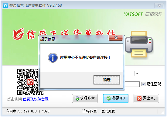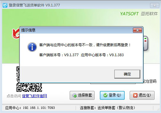 ????點(diǎn)擊“確定”指定更新程序后,點(diǎn)擊客戶端電腦登錄軟件,登錄時(shí)會(huì)提示“客戶端與應(yīng)用中心版本號(hào)不一致,請(qǐng)升級(jí)更新后再登錄”,我們點(diǎn)擊“確定”按鈕,如下圖所示:
