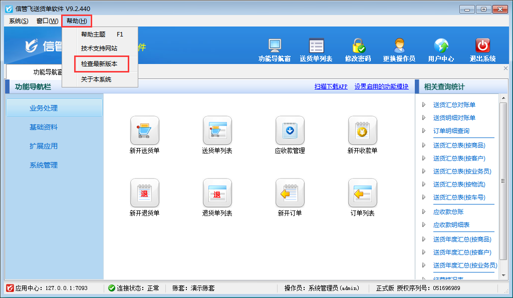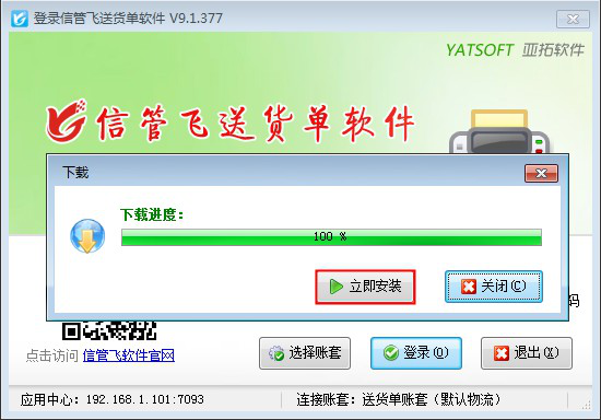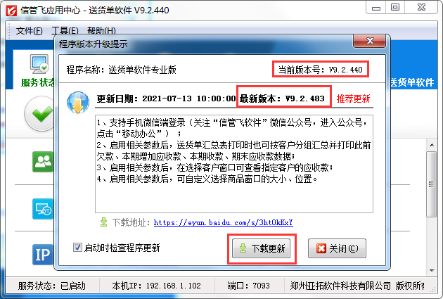 ????信管飛送貨單軟件、信管飛RMS軟件、信管飛倉(cāng)庫(kù)管理軟件等都支持網(wǎng)絡(luò)版本(即可以多臺(tái)機(jī)器同時(shí)使用,數(shù)據(jù)共享,數(shù)據(jù)集中存儲(chǔ)在一臺(tái)機(jī)器上),軟件會(huì)不定期更新新版本,網(wǎng)絡(luò)版多臺(tái)電腦使用的時(shí)候,每次更新程序需要每臺(tái)電腦都下載最新版安裝程序進(jìn)行安裝,非常麻煩。軟件支持在主機(jī)電腦的應(yīng)用中心程序上指定更新安裝程序,便于客戶端登錄的時(shí)候如版本不一致會(huì)提示直接下載安裝程序。