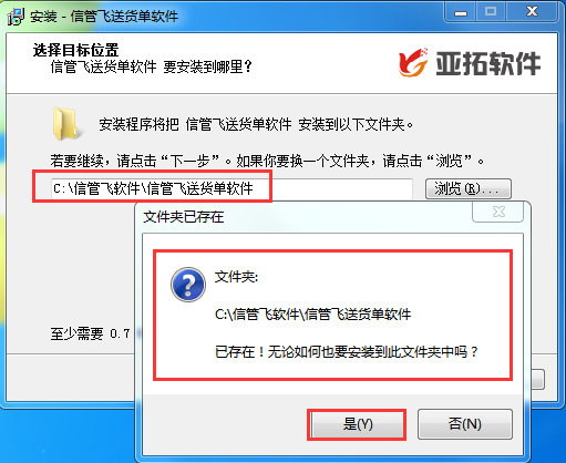 ????刪除后邊重復(fù)的內(nèi)容,點(diǎn)擊下一步,會(huì)提示文件夾中已存在軟件,是否繼續(xù)安裝在此文件夾,點(diǎn)擊“是”表示覆蓋安裝到之前的文件夾中。如下圖所示: