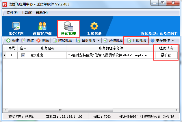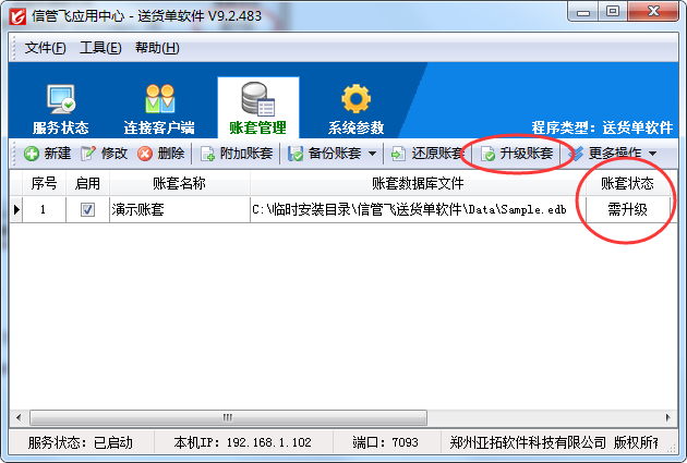 ????本文章以信管飛送貨單軟件為例,示范升級(jí)版本后賬套如何升級(jí)操作。軟件升級(jí)的版本可以直接在官網(wǎng)上下載最新版本,然后覆蓋安裝在原路徑中。安裝完成后,打開(kāi)應(yīng)用中心程序,可以在賬套管理中看到賬套狀態(tài)為“需升級(jí)”狀態(tài)。升級(jí)賬套有以下兩種方法。