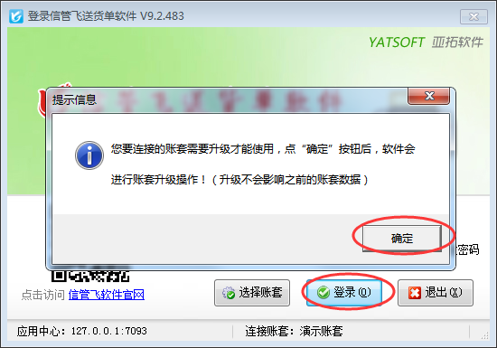 ????二、直接登錄客戶端程序進(jìn)行升級(jí);新版本安裝完成后,直接打開(kāi)客戶端程序,點(diǎn)擊“登錄”按鈕會(huì)提示“您連接的賬套需要升級(jí)才能使用,點(diǎn)“確定”按鈕后,軟件會(huì)進(jìn)行賬套升級(jí)操作!(升級(jí)賬套不會(huì)影響之前的賬套數(shù)據(jù))”,點(diǎn)擊“確定”后可直接升級(jí)賬套。如下圖所示: